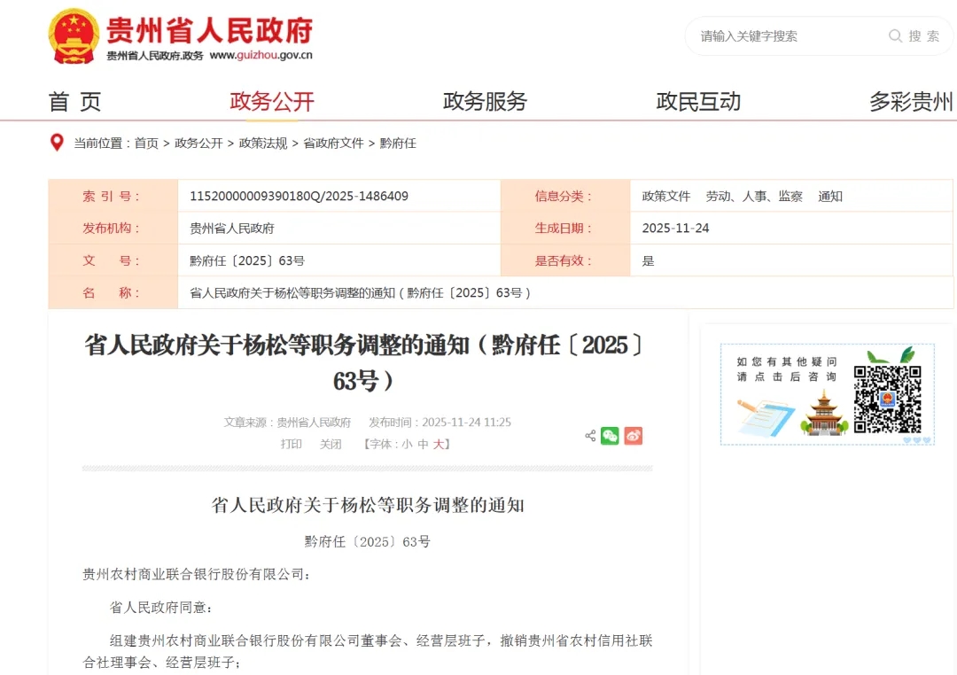 11月24日,贵州省人民政府网发布通知(省人民政府关于杨松等职务调整的通知(黔府任〔2025〕63号)),同意组建贵州农村商业联合银行股份有限公司董事会、经营层班子。
