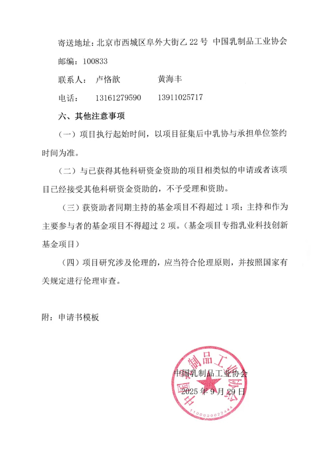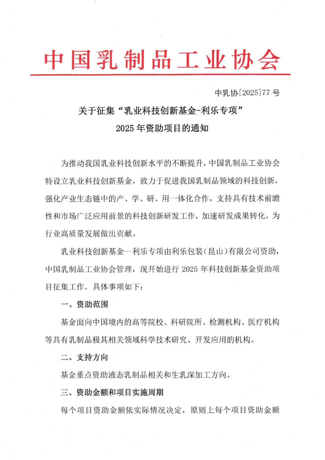中国乳制品工业协会关于征集“乳业科技创新基金-利乐专项”2025年资助项目的通知