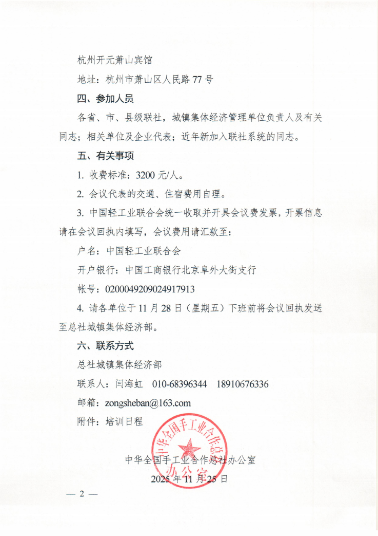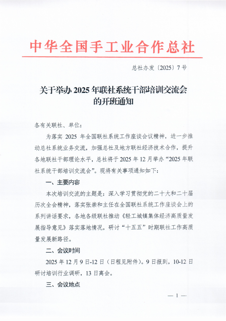 中华全国手工业合作总社关于举办2025年联社系统干部培训交流会的开班通知