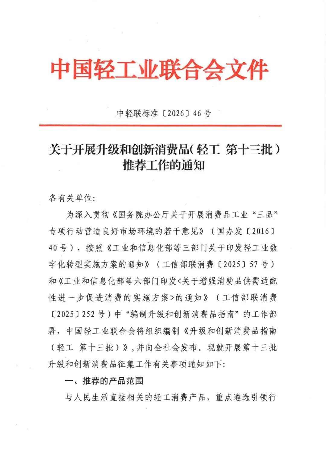 中国轻工业联合会关于开展升级和创新消费品(轻工第十三批)推荐工作的通知