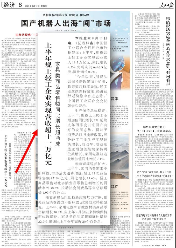 《人民日报》:上半年规上轻工企业实现营收超十一万亿元