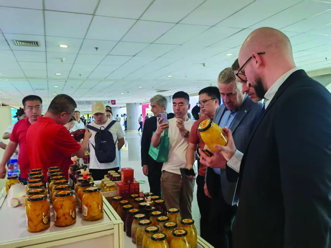 图为国外参会者在了解中国罐头产品。