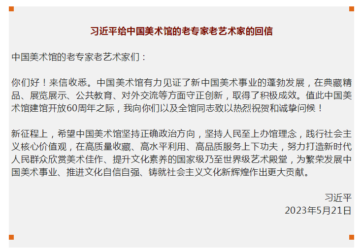 中共中央总书记、国家主席、中央军委主席习近平5月21日给中国美术馆的老专家老艺术家回信,在中国美术馆建馆开放60周年之际,向全馆同志致以热烈祝贺和诚挚问候。