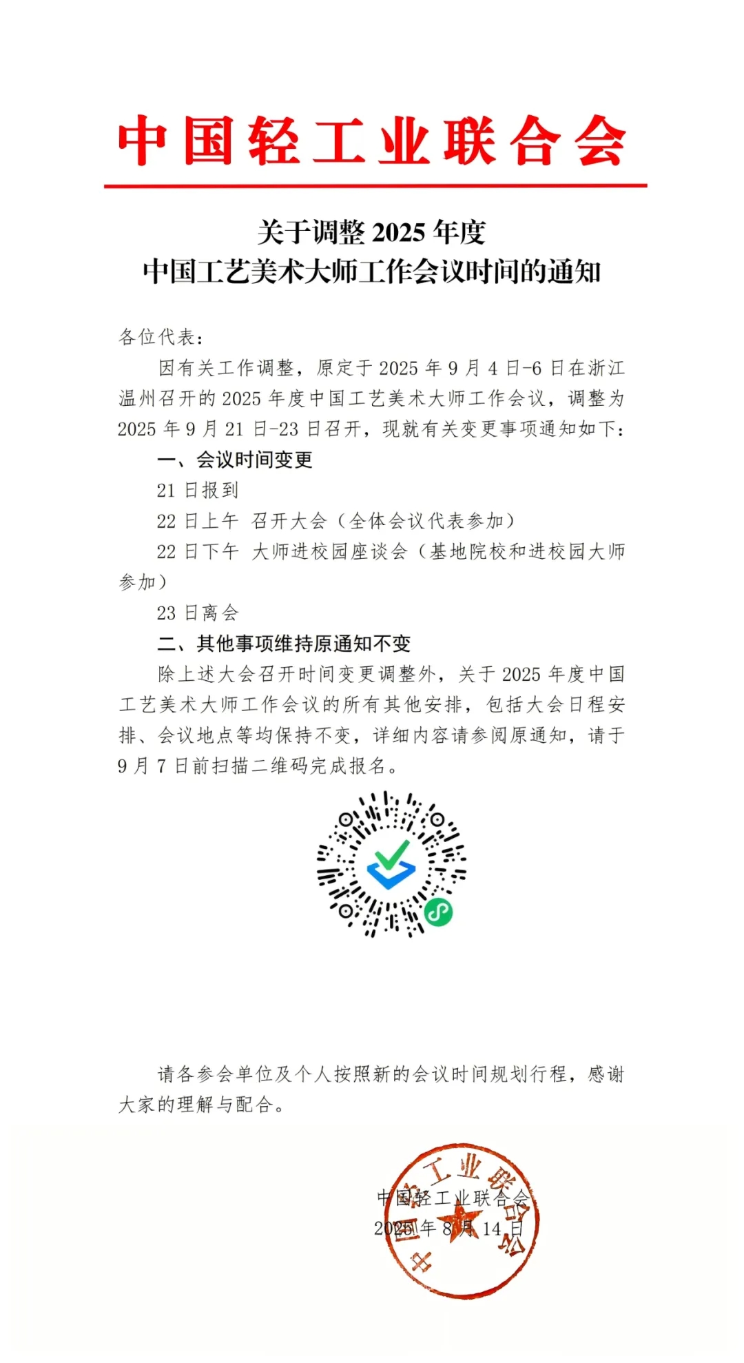因有关工作调整,原定于2025年9月4日-6日在浙江温州召开的2025年度中国工艺美术大师工作会议,调整为2025年9月21日-23日召开,现就有关变更事项通知如下: