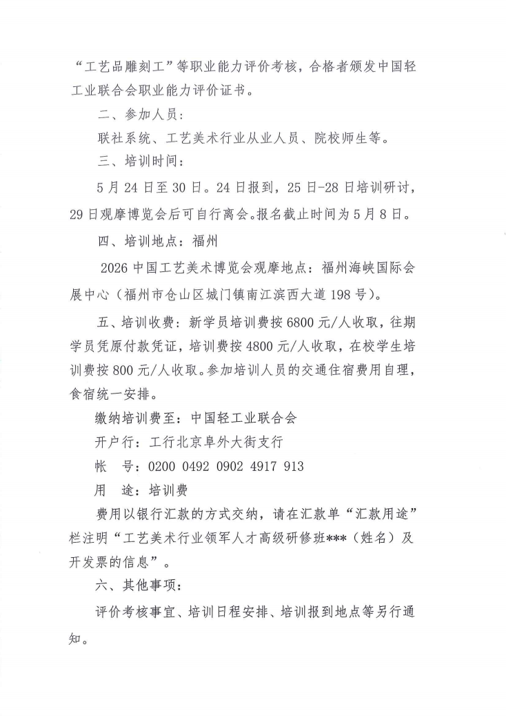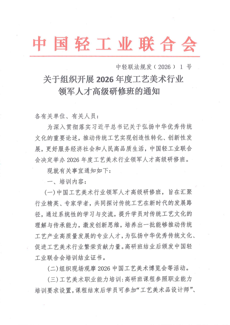 中国轻工业联合会关于组织开展2026年度工艺美术行业领军人才高级研修班的通知