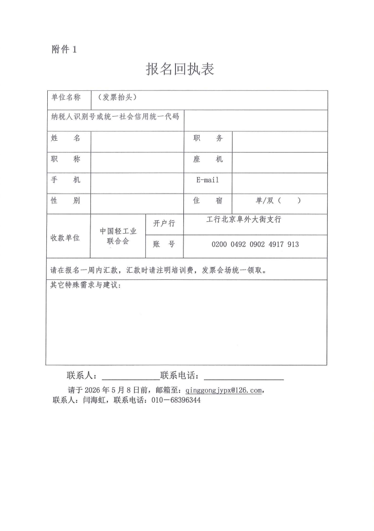 缴纳培训费至:中国轻工业联合会