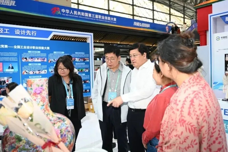 中国轻工业联合会展台不仅展示了近年来在中国轻工联在技能竞赛组织、人才培养体系建设以及行业技术推广等方面的重要成果,而且还有多位大师工匠实操展演展示轻工行业独具魅力的技能风采。刘江毅副会长观看了陶瓷雕刻、青花绘画等传统工艺演示,详细询问了技艺传承、产品创新及市场应用等情况,对大师工匠的精湛技艺表示赞赏,对年轻一代融合传统与创新的探索给予鼓励。