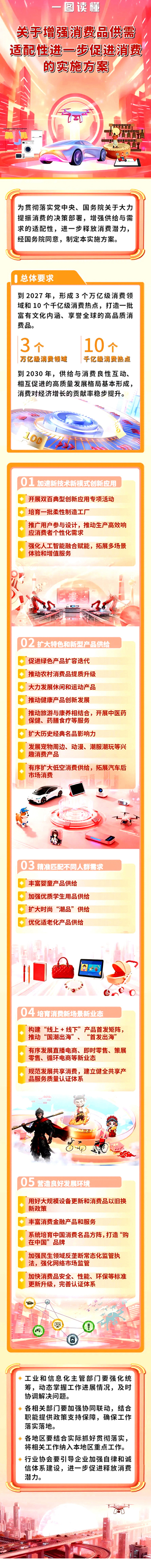 为贯彻落实党中央、国务院关于大力提振消费的决策部署,增强供给与需求的适配性,进一步释放消费潜力,经国务院同意,制定本实施方案。