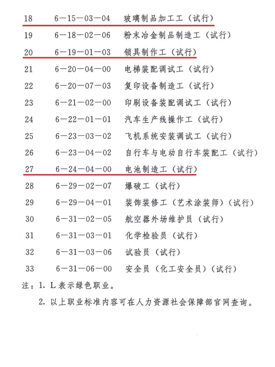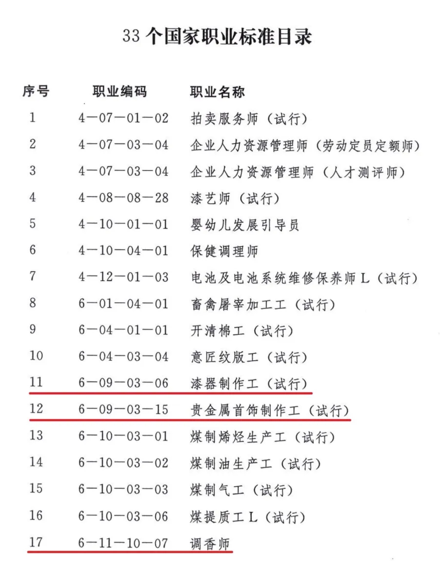 人力资源和社会保障部办公厅近日印发《关于颁布拍卖服务师等33个国家职业标准的通知》(人社厅发〔2025〕35号),中国轻工业联合会统筹承担的《漆器制作工》、《贵金属首饰制作工》、《调香师》、《玻璃制品加工工》、《锁具制作工》、《电池制造工》6项国家职业标准获准颁布。