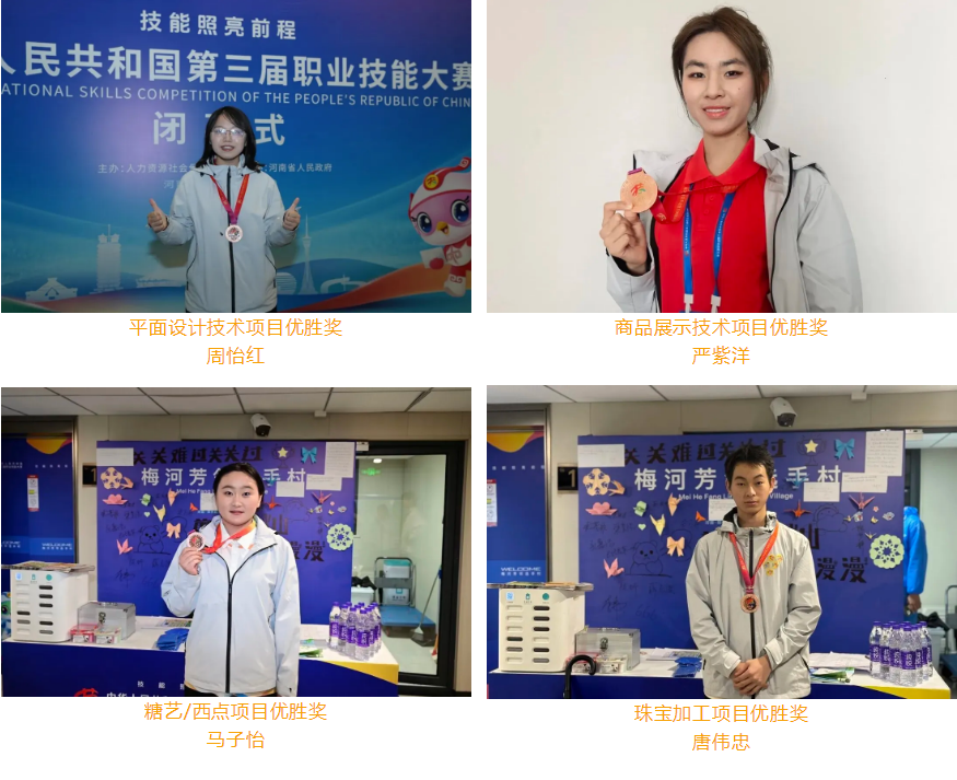 本届国赛,中国轻工业联合会代表团的12名小将奋力拼搏,勇创佳绩。其中,张明天获得花艺项目金牌,李锐涛获数字交互媒体设计项目铜牌,梁博然获木工项目铜牌,马子怡、唐伟忠、严紫洋、周怡红、邵钧灏、曾泽熙、钟文广、龙威分别获得糖艺/西点制作项目、珠宝加工项目、商品展示技术项目、平面设计技术项目、烘焙项目、精细木工项目、家具制作项目、工业设计技术项目优胜奖。钟文广还获得最佳选手奖。此外,张明天、李锐涛、梁博然与进入各自赛项前十名的选手马子怡、唐伟忠、严紫洋、周怡红、邵钧灏一起入围世赛国家集训队,将作为全国顶尖技能种子选手进行深入培训、考核选拔,努力冲击明年在上海举办的第48届世界技能大赛。