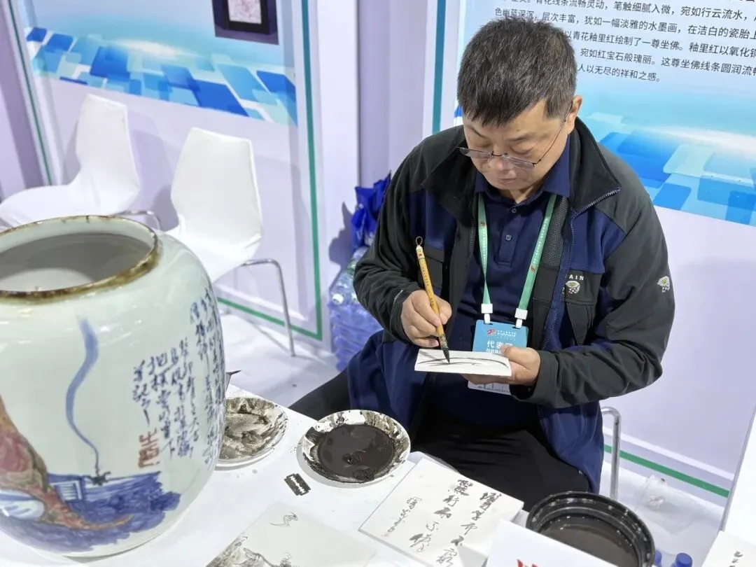 图为全国陶瓷行业技术能手马俊在进行青花绘画项目技艺展演。青花绘画以钴料为墨,白瓷为纸,在高温窑火中绽放出蓝白交织的艺术之花,是中国陶瓷装饰技艺的璀璨明珠。这种将绘画艺术与制作工艺完美结合的技艺,既承载着千年陶瓷文化底蕴,又不断在创新中焕发时代光彩。