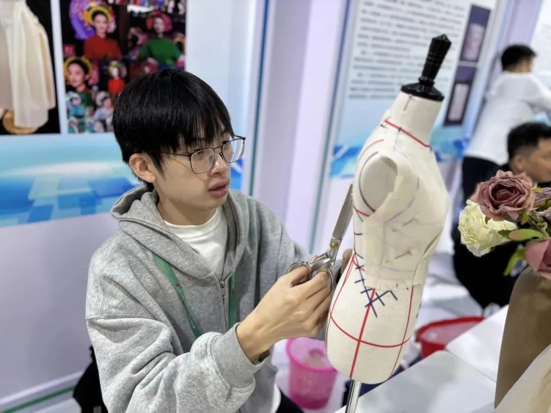 图为专业师生展示服装立体裁剪技艺。该展演项目安排1︰2人台服装立体裁剪实操,由专业师生现场演绎从版型设计到面料塑形的完整流程,同步展示簪花制作等传统工艺的精细技法。