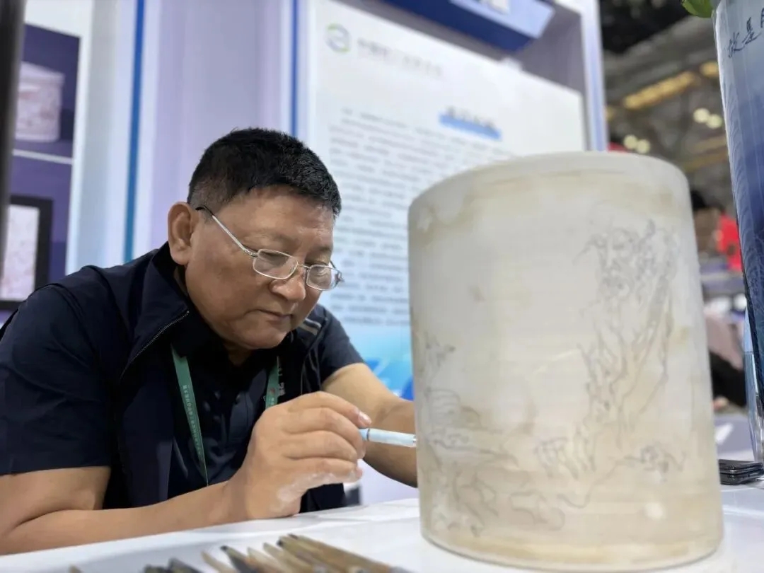 图为江西省工艺美术大师钟福洪在展示陶瓷雕刻技艺。该技艺将明清木雕、石雕、玉雕的浮雕工艺技法融入其中,还运用镂雕、堆雕、微雕等多种技法,让作品层次丰富、立体感十足。