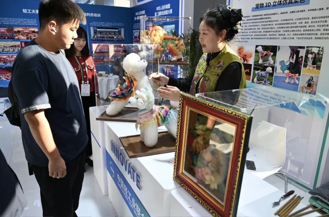 这两日,在中华人民共和国第三届职业技能大赛系列活动现场,中国轻工业联合会精心策划并打造的专题展台人气爆棚,场面火热。展台以“技艺传承、人才培育、创新发展”为主线,通过图文展板、视频影像及现场互动等形式,全面呈现了轻工行业在技能竞赛组织、人才培养体系建设与技术推广等方面的丰硕成果。展台现场还安排了宠物3D立体仿真染色、瓷上手指画、珐琅彩彩绘、服装立体裁剪、陶瓷雕刻、青花绘画6项技艺互动展示环节,邀请多位大师工匠实操展演。自开幕以来,展区始终人头攒动,热烈气氛持续升温,吸引了众多观众、行业专家及媒体驻足交流。