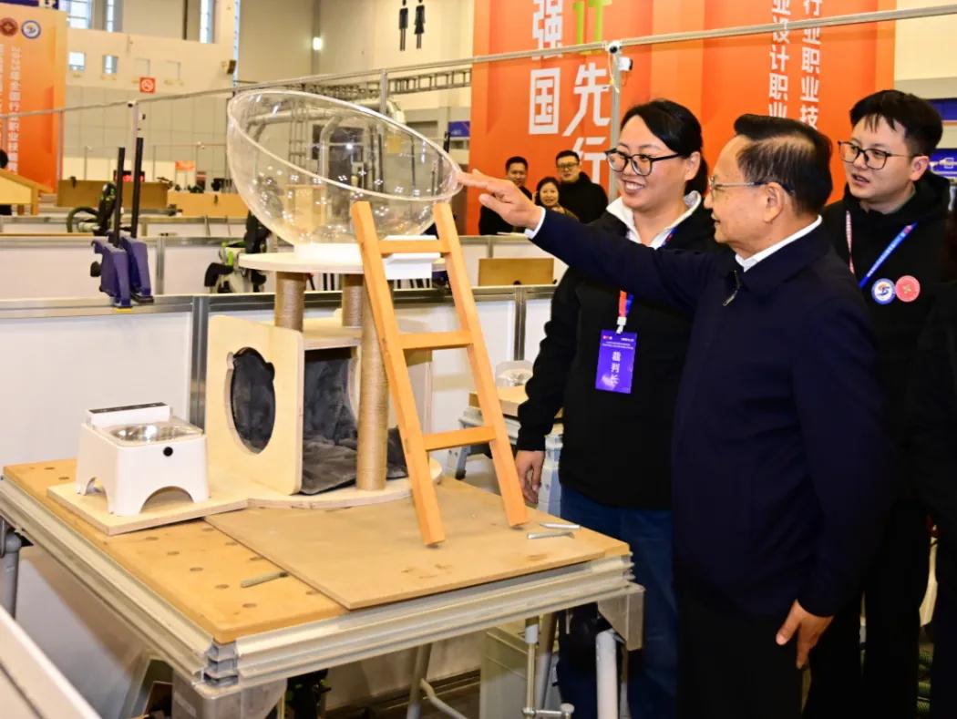 在家具设计师赛项,张崇和观看了选手现场制作的多功能宠物家具并与选手亲切交流,勉励他们立足市场需求,设计兼具观赏性、功能性与可落地性的作品,有效服务人民美好生活。张崇和表示,大赛以赛促产功效显著,赛事过程中已出现企业签约聘用选手、洽谈合作的案例,这凸显大赛的产业吸引力与人才输送功能,后续要继续推动竞赛成果向企业产品、市场商品转化,推动竞赛选手向职业能手转变。