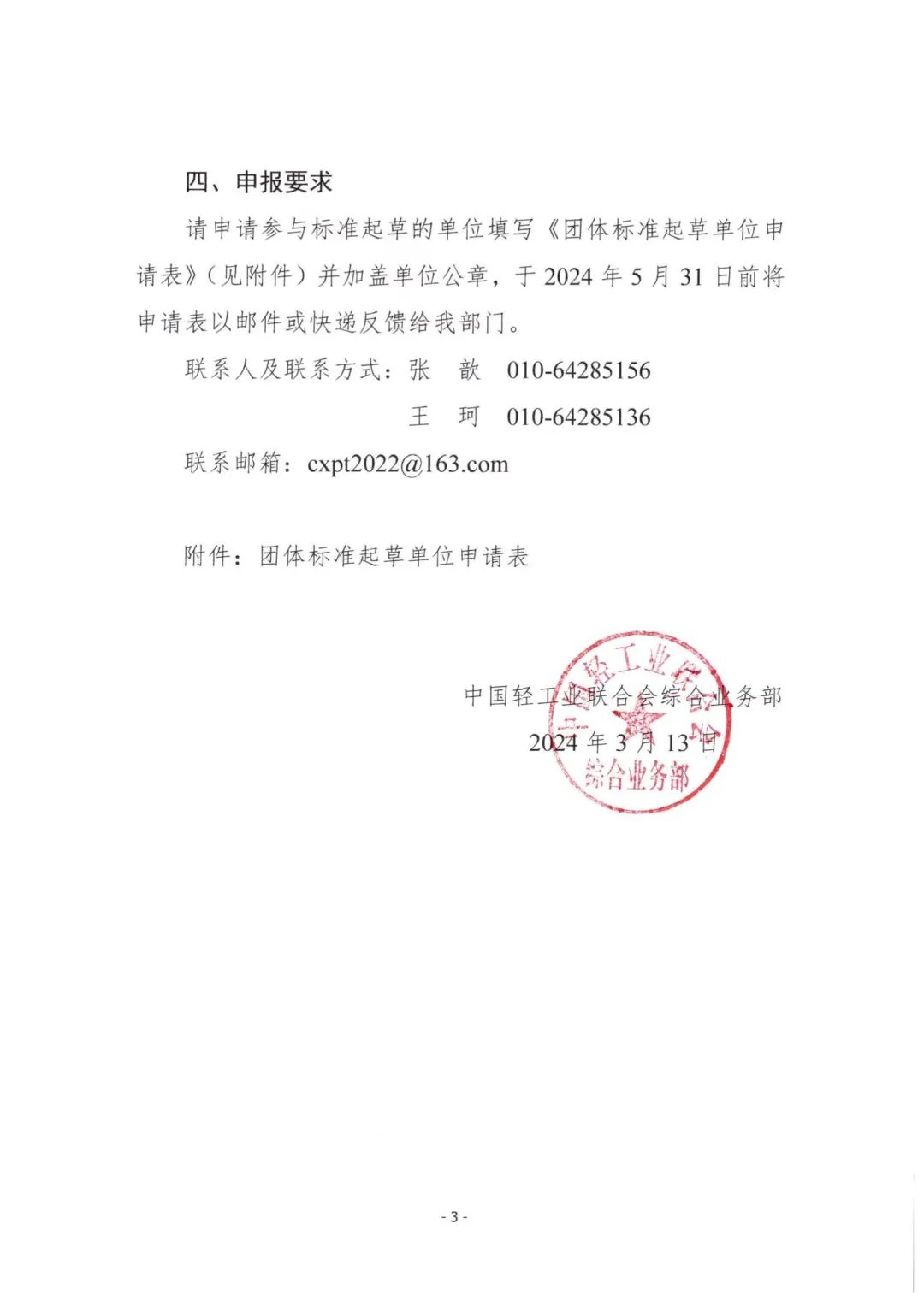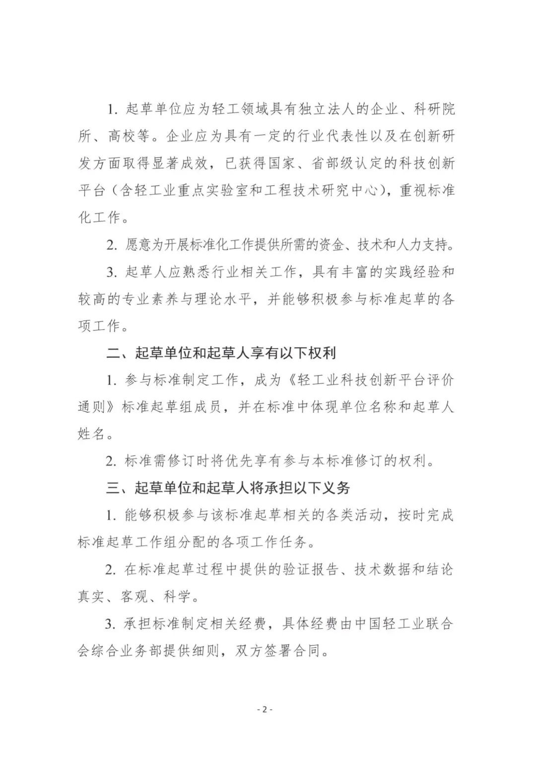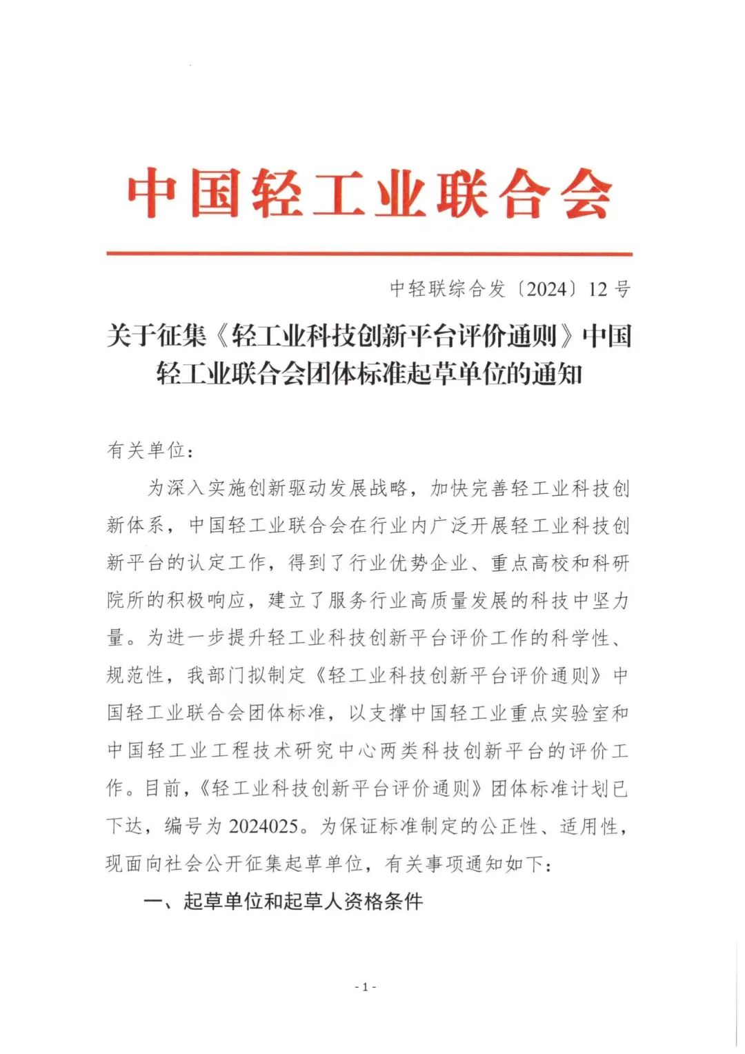 关于征集《轻工业科技创新平台评价通则》中国轻工业联合会团体标准起草单位的通知