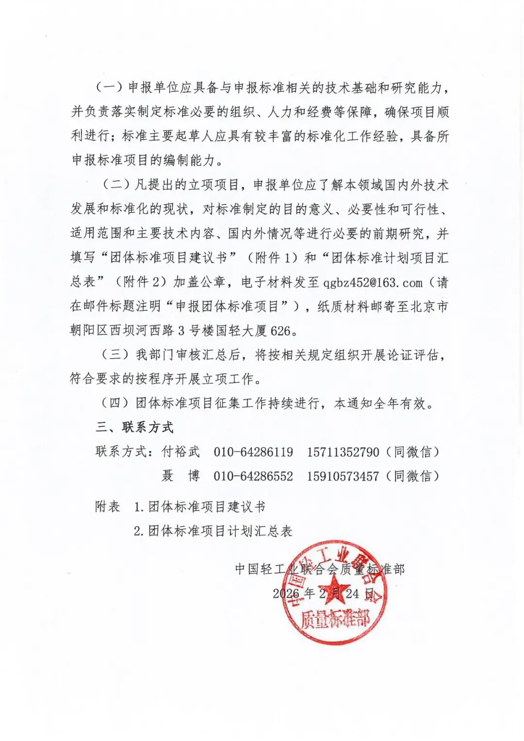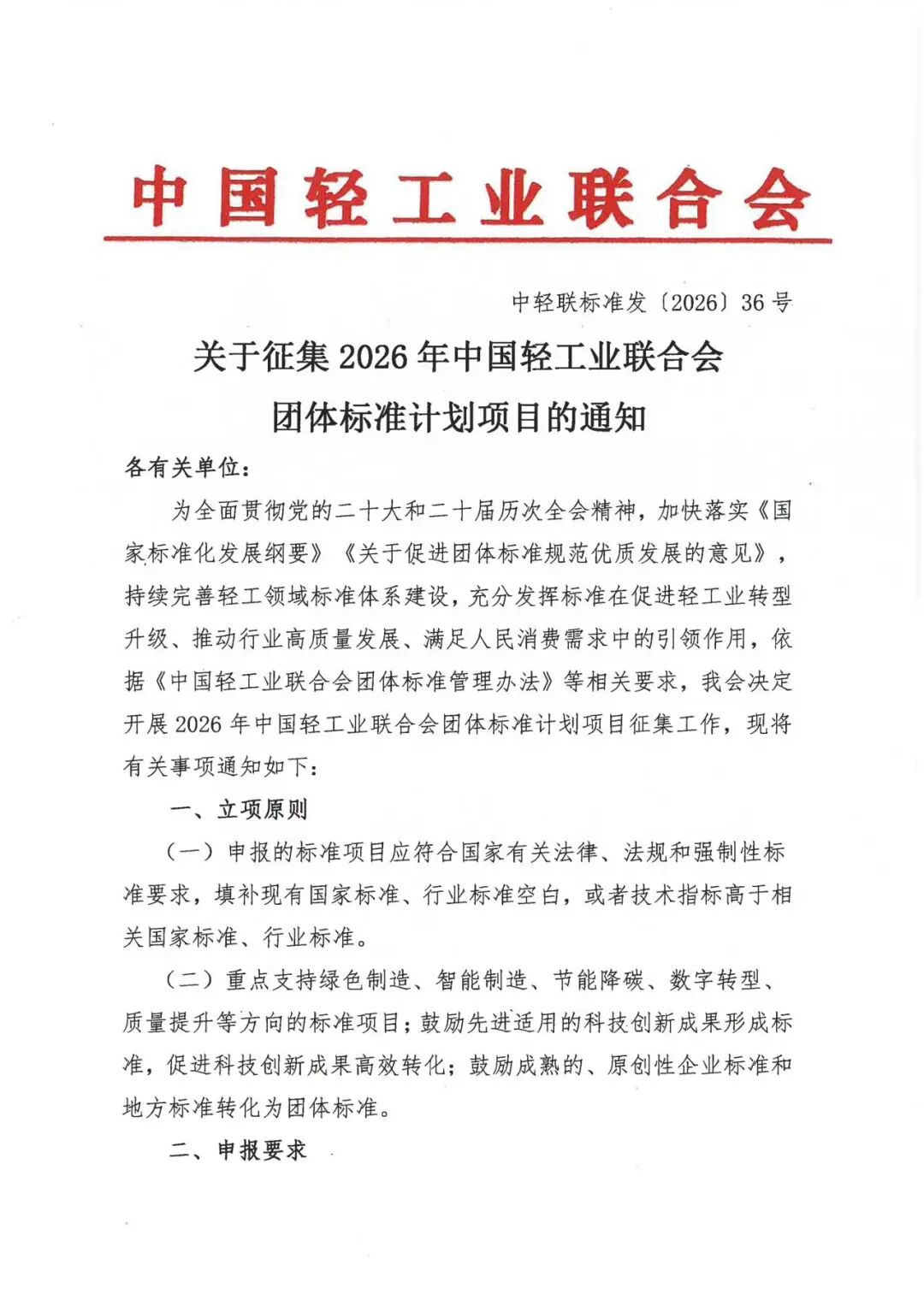 关于征集2026年中国轻工业联合会团体标准计划项目的通知