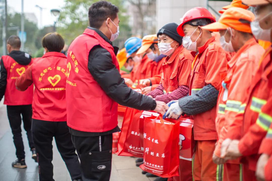 “瓯江红·楠溪情”浙江省永嘉县党群联盟为深入开展“我为群众办实事”实践活动和持续发放“真爱到家·党群联动”幸福礼包关爱服务。1月26日,永嘉县绿文公益中心、永嘉县党群服务中心、团县委、黄田街道金色家园金色驿站、永嘉恒升村镇银行黄田支行、南城街道社工站、永嘉县慈善基地、绿育文化宣传义工队等联合为黄田街道环卫工人、县城环卫工人以及物业保安等群体代表发放100份小年夜的暖心礼包。
